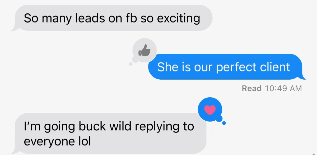 Youuuu guyyssss! I cannot. This program is fuggin incredible! I have had 35 new leads across all platforms within 24 hours, as well as 3 completed phone consults which have all booked annnndd another 4 scheduled (so far) for this next week :) What whaaat!